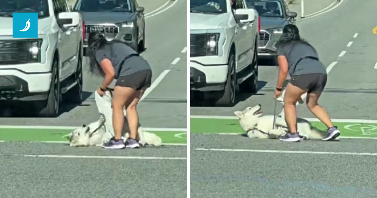 Korisnica TikToka @jessinthemountains77 podijelila je snimku nastalu dok je čekala na semaforu. Preko puta nje, na raskrižju, žena se mučila kako bi podigla svog haskija s asfalta. Pas je, međutim, ležao nasred ceste i činilo se da misli kako se njegova vlasnica samo želi igrati dok ga pokušava podići.